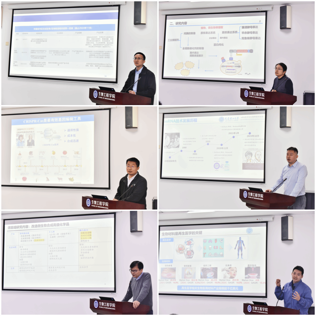 薛闯致欢迎辞并系统介绍了学院在智能生物制造、合成生物学、生物医疗等领域的科研实力与成果转化布局。他指出,近年来学院始终坚持“四个面向”,通过“学科-产业-市场”联动机制,推动科研成果从实验室走向生产线,依托智能生物制造教育部重点实验室等科研平台,在农业废弃物资源化利用、生物能源开发、高端生物医药材料等方向取得突破,并已在多地实现产业化应用。