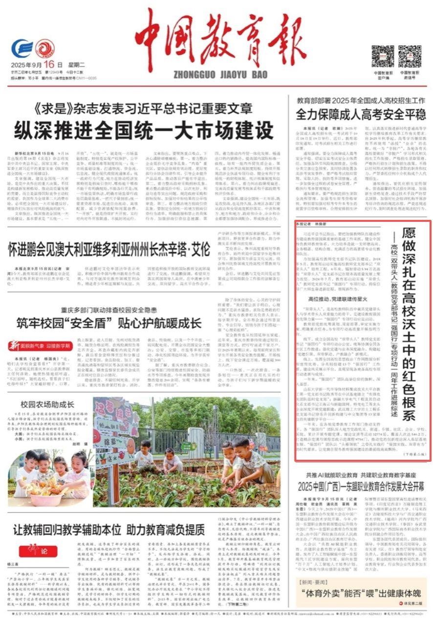 近日,《中国教育报》对高校“双带头人”教师党支部书记“强国行”专项行动一周年工作进展进行了专题报道,其中介绍了我院生物过程工程教工党支部书记贾凌云教授带领支部攻克“血液毒素精准识别与清除”技术壁垒,努力践行守护人民生命健康的使命担当。报道以《愿做深扎在高校沃土中的红色根系》为题,全面展现了全国高校“双带头人”教师党支部书记在党建引领下服务高质量发展的重要成果。