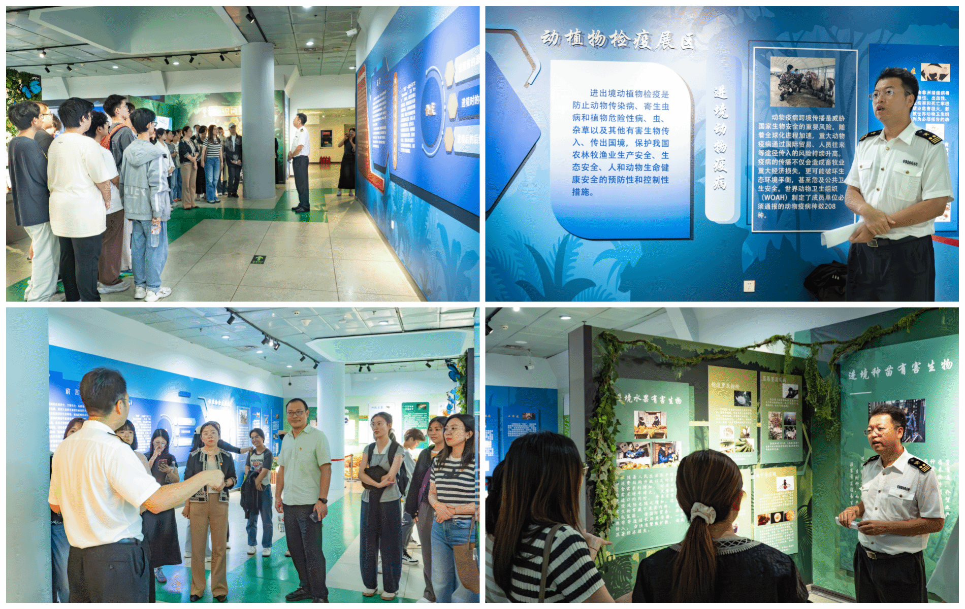 在博物馆讲解员引导下,师生们有序步入展区。展览聚焦“动植物检疫”“卫生检疫”等核心内容,结合近年来我国口岸检疫案例,介绍了“非洲猪瘟”“高致病性禽流感”等动物疫病相关的跨境动物运输、产品传播及其精准检疫阻断扩散等问题。“病媒生物”主题展区成为关注的焦点,展区内,鼠类、蚊类、蜱类、蝇类等常见病媒生物的标本被整齐陈列,引起师生们的热烈讨论。博物馆讲解员对展出标本进行详细介绍,细致讲解病媒生物监测、防控技术及应急处置措施,耐心解答师生们提出的相关问题。