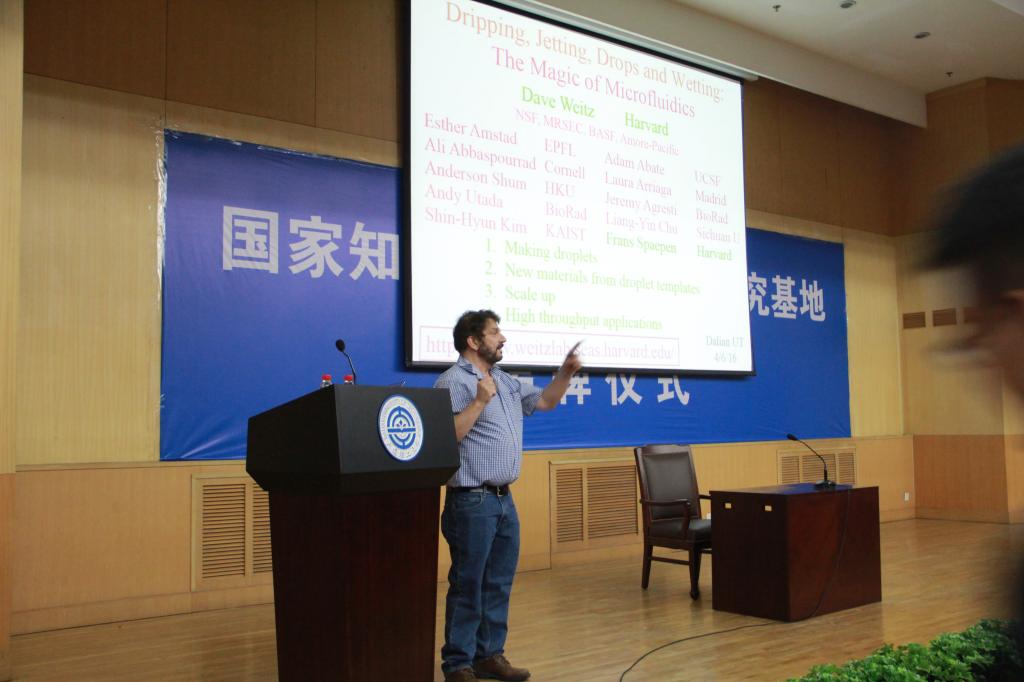 4月6日上午,Weitz教授参观了我校生命科学与技术学院、精细化工国家重点实验室、机械学院微加工教育部重点实验室,对我校生物医学材料、微流控芯片设计加工、荧光染料等领域的工作表示出浓厚的兴趣,通过与相关教师的深入交流,加深了对我校科研水平和能力的了解。当天下午2点,Weitz教授在伯川图书馆报告厅为我校师生作了题为《Dripping, jetting, drops and wetting: the magic of microfluidics》的学术报告,报告围绕可控多样化乳液的微流体制备、商业化放大及应用等方面深入浅出地展开。报告厅座无虚席,300多师生聆听了国际学术大师的精彩报告。Weitz教授的研究将微流体的应用发挥到极致,在场的师生被微流体的魔力深深吸引,现场互动环节气氛热烈。Weitz教授幽默的谈吐、渊博的知识和创新的思维,让大家领略到了国际一流学术大师的风范。