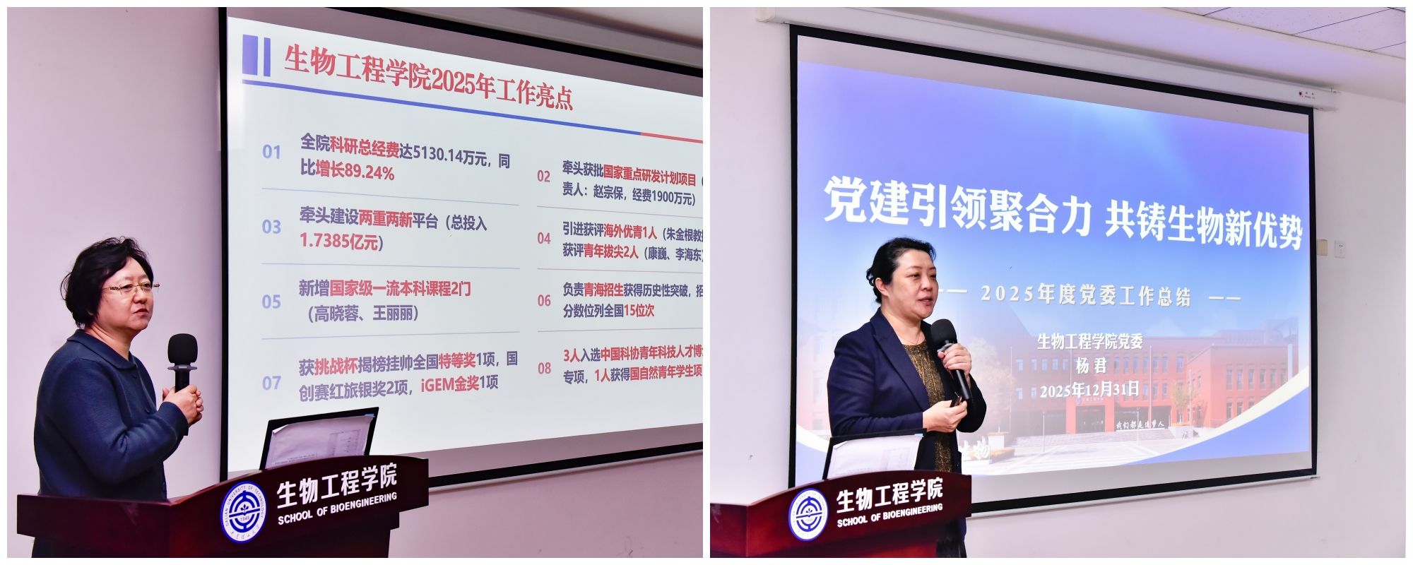 学院党委书记杨君教授以“党建引领聚合力 共创生物新优势”为题,系统总结了学院党委全年工作成效。2025年学院党委坚持以习近平新时代中国特色社会主义思想为指导,深入学习贯彻党的二十大和二十届历次全会精神,紧密围绕学校“新优势锻造年”主题与“353工程”战略部署,切实把党的政治优势、组织优势全方位、全过程转化为驱动学院发展的创新动能与发展实效。党委严格落实“第一议题”制度,前置把关研究学科建设、人才引育等重大事项;扎实开展深入贯彻中央八项规定精神学习教育,分级分类制定学习计划,多维联动深化学习实效;深化“一融双高”,聚焦新优势锻造目标,实施“挂图作战”,创新推行“班子领题攻坚”“支部揭榜挂帅”机制,学院党委获推荐申报全国党建工作标杆院系(全校2个),生物过程工程教工党支部获评辽宁省党支部标准化规范化示范点(全校1个),贾凌云教授“双带头人”支部书记案例入选辽宁省案例汇编并获《中国教育报》报道,顺利完成学校首批“党建+育人”试点验收,建设经验在东北三省高校生命科学院长论坛进行分享,获批1项省级党建研究课题,2024年度“一融双高”特色党支部结项优秀率100%(2个),新一批立项100%获批(3个)。她表示,2026年学院党委将持续深化政治引领,聚焦中心工作,设立由党委领衔、支部参与的攻关项目,切实将学习成果转化为规划思路、改革措施和创新实践,全面实施党支部“强基、提质、创优”计划,拓展“党建+产学研用”协同生态,凝练打造“一支部一品牌”特色矩阵,为学院可持续高质量发展提供坚强政治保障。