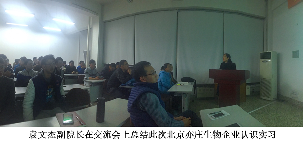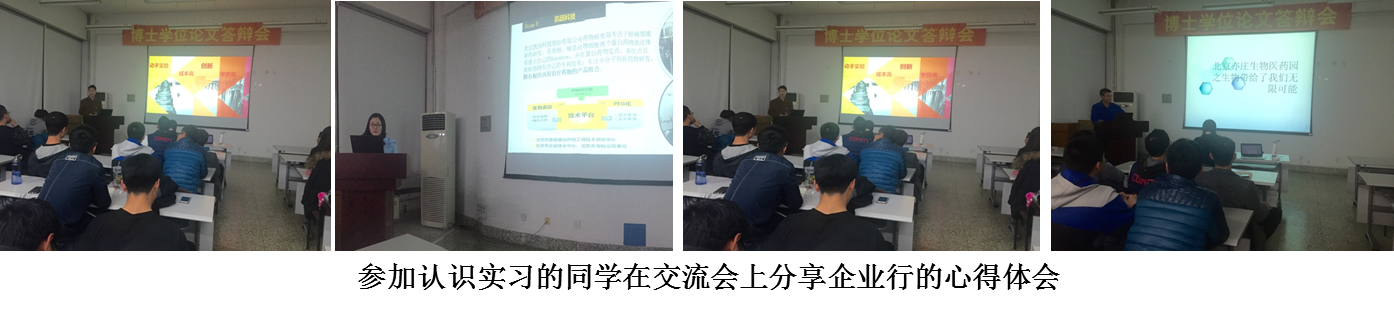实习结束后,参加认识实习的同学们又将自己的所见所闻以及感受体会分享给了未能前往的同学。2016级全体学生、实习带队老师以及班主任屈明博讲师于3月4日晚6:30在生物楼113举行了北京亦庄企业认识实习总结会暨交流会。每位参加实习的同学都以PowerPoint的形式回顾了自己的北京之行,用各自的视角重温了整个实习过程。有些同学重点介绍了自己感兴趣的生物企业;有些同学分享了参观过后的感想;有些同学结合实习内容开始规划自己的大学生涯。同学们分享的内容异常精彩,为实习活动锦上添花。
