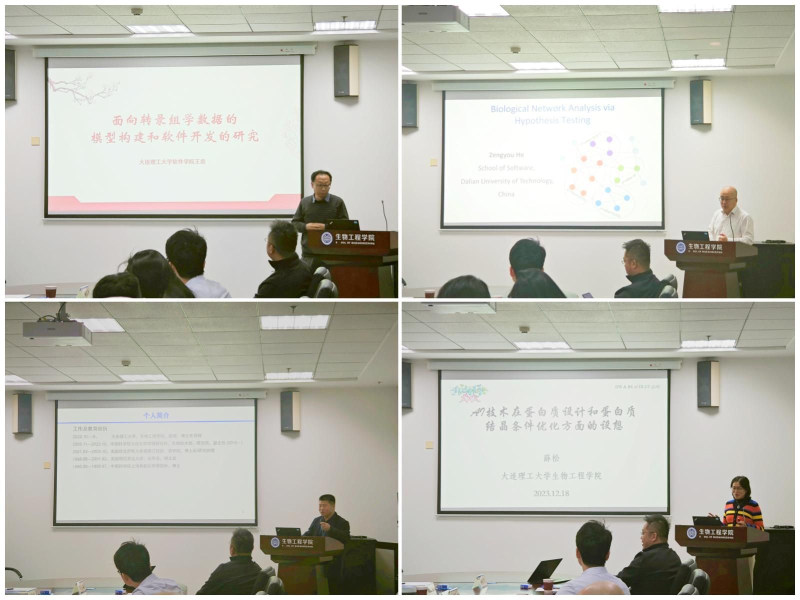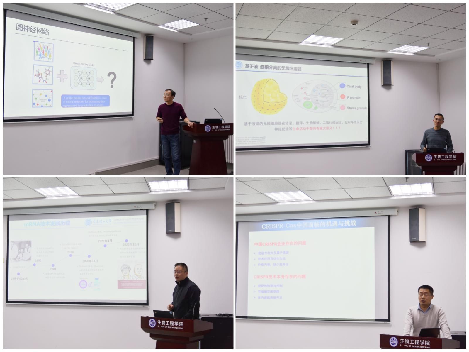 计算机学院申彦明教授以“基于图神经网络的分子建模”为题,介绍了图神经网络技术在不同学科研究场景下的实际应用。软件学院王忠教授以“面向转录组学数据的模型构建和软件开发的研究”为题,介绍了生物学转录原理及围绕转入调控元素识别、转录因子节危险预测、转录调控网络预测等工作开展的相关研究。软件学院何增有教授以“基于假设检验的生物网络分析”为题,介绍了如何利用网络假设检验的方式控制各类生物质检测质量。生物工程学院赵宗保教授以“非天然辅酶偏好性改造”为题,从生物转化技术、生物合成技术及化学生物学三个方向,介绍了利用生物制造来获取油脂或天然脂质代谢产品的研究发展。生物工程学院薛松教授以“AI技术在蛋白质设计和蛋白质结晶条件优化方面的设想”为题,提出了利用AI技术的强大算力,进行蛋白质晶体条件的优化,从而实现蛋白质设计的设想。生物工程学院林佳奇教授以“mRNA药物和疫苗:数字化药物的先行者”为题,介绍了利用人体自身的细胞工厂进行mRNA药物研发相比于传统药物研发技术的巨大优势。生物工程学院刘嵘明教授以“基因编辑核酸酶的挖掘与应用”为题,介绍了如何利用高精度基因编辑核酸酶的开发,实现高精度、高效率的基因编辑。生物工程学院康巍副教授以“酶催化的空间工程”为题,介绍了基于液液相分离的反应器,将酶的催化过程与AI技术相融合。