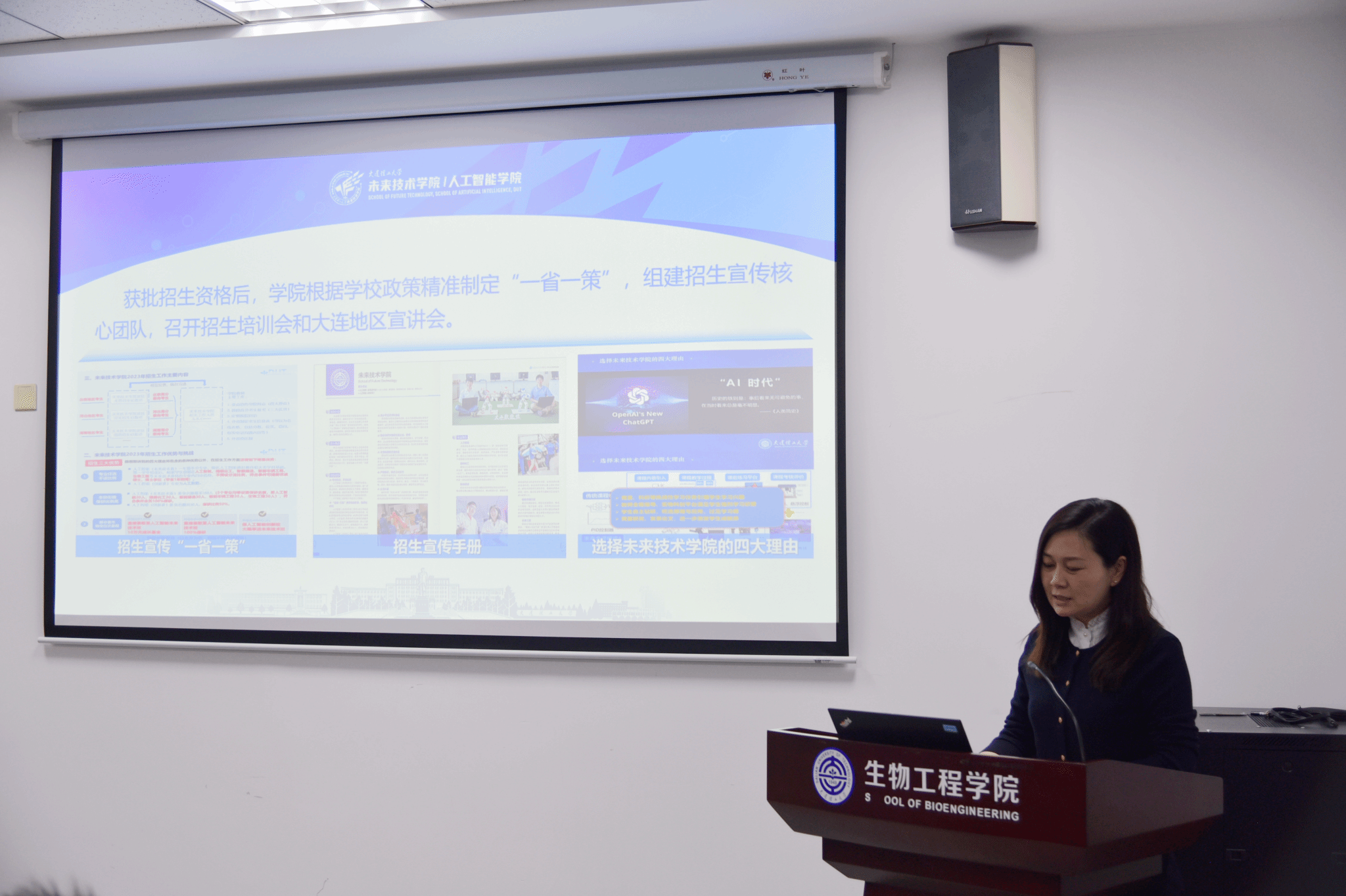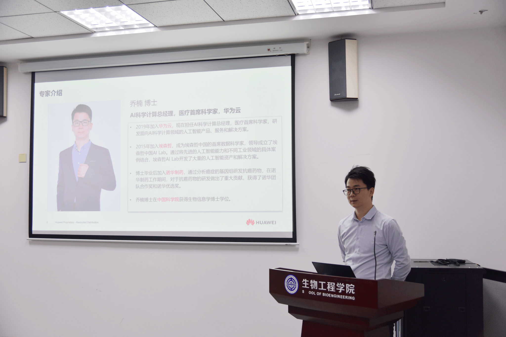 12月18日,生物工程学院人工智能生物交叉学术研讨会暨“知微育见•对话未来”主题讲座活动在知微楼128会议室举行。华为云AI4Science总经理、医疗首席科学家乔楠,华为云辽宁基地拓展总经理刘振杰,华为云计算校招HR赵旻,华为云计算AI科学工程师赵彬等作为特邀嘉宾出席活动,生物工程学院院长贾凌云教授,未来技术学院党委书记侯庆敏,学院领导班子、相关领域专任教师和来自计算机学院、软件学院、化工学院的教师代表共同参加了会议。会议由生物工程学院党委书记杨君教授主持。