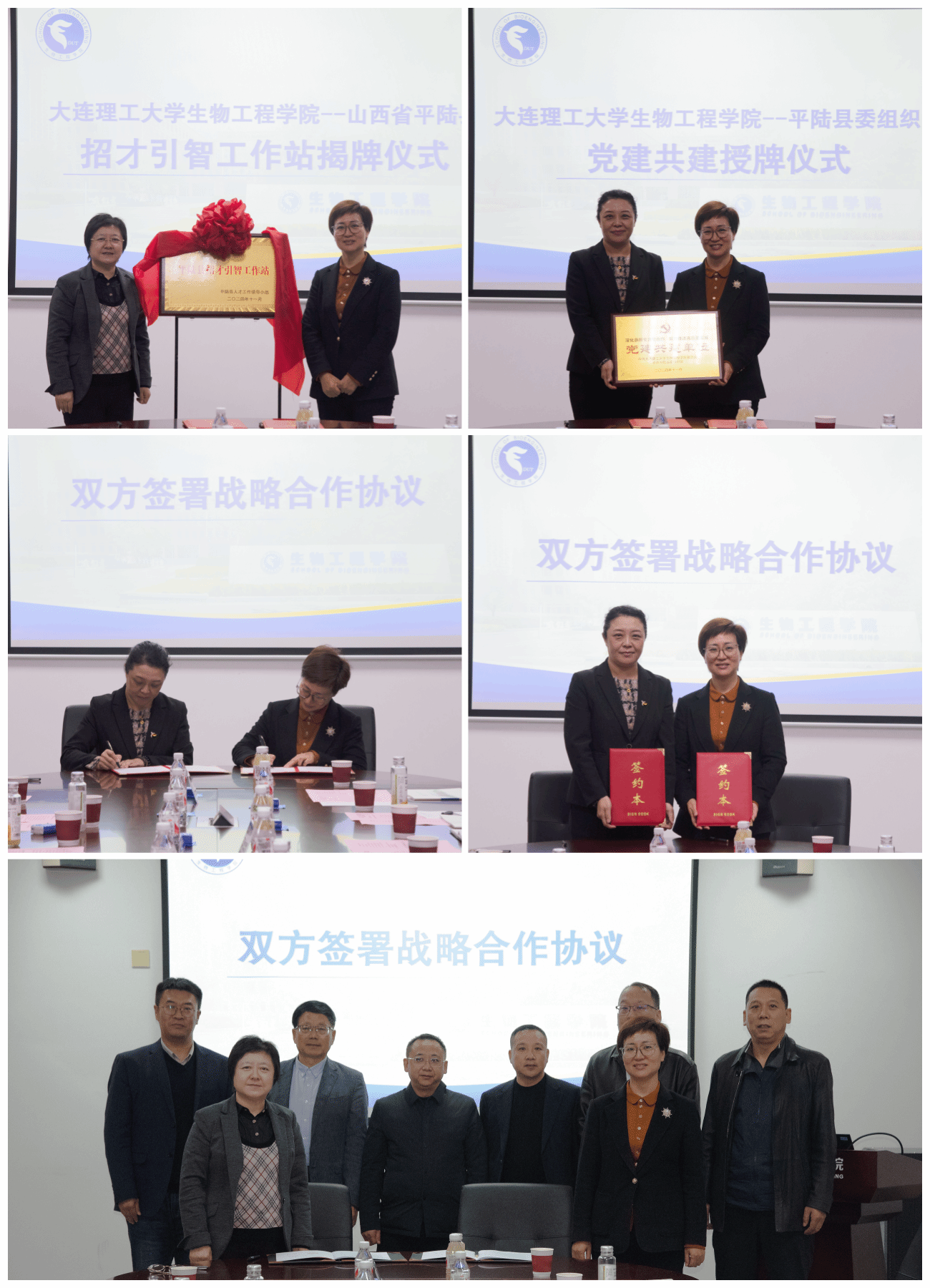 会上,举行了大连理工大学生物工程学院--平陆县招才引智工作站揭牌仪式和党建共建授牌仪式,杨君代表学院与闫小娟签署党建共建合作协议,并赠予对方纪念品。贾凌云、闫小娟代表双方签署战略合作协议。