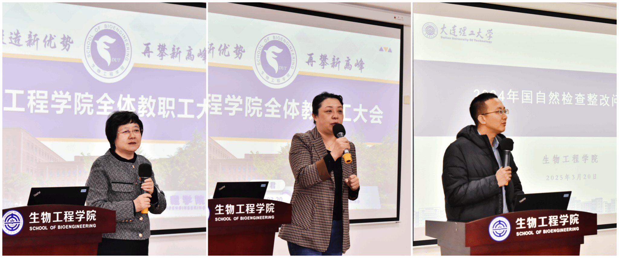 党委书记杨君教授领学全国两会精神,传达学习习近平总书记在辽宁考察时的重要讲话精神,结合学校2025年全面从严治党工作会议暨警示教育大会精神,通报了高校领域违规违纪典型案例,要求全体教师严守政治纪律,筑牢思想防线,并逐项传达《中共大连理工大学委员会2025年党的建设工作要点》及《关于在全党开展深入贯彻中央八项规定精神学习教育的通知》具体要求,进一步强调保密工作纪律的重要性,要求全体教师要强化数据安全管理,同时传达学校党群工作会议精神,她强调,学院要锚定“新优势锻造”目标,以高质量党建引领学校“353工程”实施,以全面从严治党保障发展航向,以“钉钉子精神”落实重点工作,奋力书写学院高质量发展的“生工答卷”。