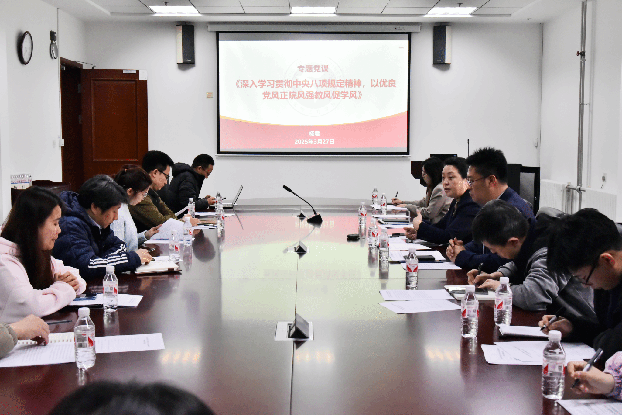 会上,学院党委书记杨君以“深入学习贯彻中央八项规定精神,以优良党风正院风强教风促学风”为题讲授专题党课,领学习近平总书记关于深入贯彻中央八项规定精神学习教育的重要指示精神,结合高校科研管理、师德师风建设等实际案例,深入解读中央八项规定及其实施细则精神的核心要求,详细介绍了学院学习教育实施方案,明确了“学深悟透、查摆问题、整改落实”三阶段任务,并就方案内容与参会党员深入开展交流。
