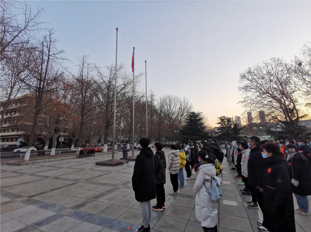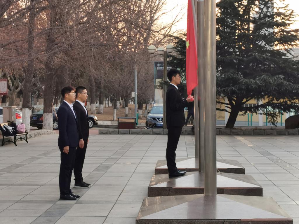顶着早晨凛冽的寒风,学院的学生干部们在六点半便完成了设备调试,并为全体观礼同学准备了贴在右胸前的小国旗,一切准备就绪。七点整,升旗仪式正式开始,伴随着庄严的中华人民共和国国歌,五星红旗随朝阳冉冉升起,全场齐唱国歌并向国旗行注目礼,深切表达了对祖国的无限崇敬。