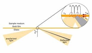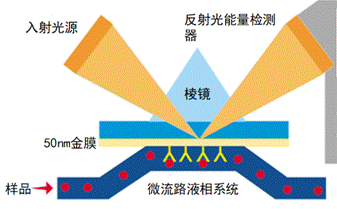 当一束光线通过棱镜射向金属表面,在金属发生全反射现象时,会在金属膜中产生消失波,消失波与表面等离子波发生共振时,检测到的反射光强会大幅度地减弱。此时对应的入射光波长为共振波长,对应的入射角为共振角,即SPR角。SPR角随着金属表面折射率的变化而变化,而折射率的变化又与金属表面结合的分子质量成正比。