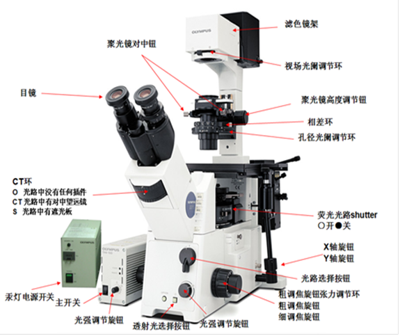 4. 将荧光光路shutter打开(“○”为开,“●”为关),需保护样品时关闭shutter